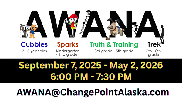 Public Online Giving Event Calendar Group Finder Opportunity Finder Private My User Account My Groups My Events My Purchase History My Giving My Contribution Statement Login anonymous Show Summary (0) Event Details AWANA 6:00 Back to Calendar Scripture-based programing designed to promote Bible literacy and help kids develop lifelong faith in Christ. Kids are placed on teams for the whole school year. They enjoy friendly competition within our Awana club and with other clubs across Alaska. Kids establish friendships through fun games and internalize more than 700 Bible verses that will be with them for a lifetime. Ministry Area: AWANA When: Sunday, January 4, 20266:00 PM - 7:30 PM Add To Calendar Where: Raspberry Campus6689 Changepoint DrAnchorage, AK 99518-1578 Map This Meeting Instructions: ChangePoint Raspberry Campus on Sundays 6:00- 7:30 p.m. Contact: Putt, Rod