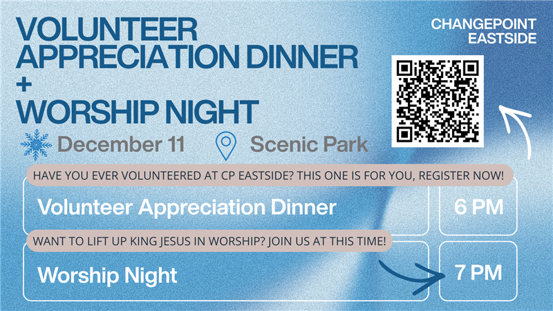 Public Online Giving Event Calendar Group Finder Opportunity Finder Private My User Account My Groups My Events My Purchase History My Giving My Contribution Statement Login anonymous Show Summary (0) Event Details Eastside Volunteer Appreciation Dinner & Worship Night Back to Calendar We want to celebrate our volunteers with a catered dinner & time of worship afterwards! If you are an Eastside volunteer join us on Thursday, December 11th at 6pm for a wonderful dinner and a worship night to follow from 7-8pm at Scenic Park Bible Church. Ministry Area: Eastside Activities When: Thursday, December 11, 20256:00 PM - 8:00 PM Add To Calendar Where: Eastside Campus7145 Madelynne DrAnchorage, Alaska 99504 Map This Meeting Instructions: We want to celebrate our volunteers with a catered dinner & time of worship afterwards! If you are an Eastside volunteer join us on Thursday, December 11th at 6pm for a wonderful dinner and a worship night to follow from 7-8pm. Because we are catering the dinner please register for this event so we know how many we are feeding! Contact: Swan, Sofia Registration Not Available